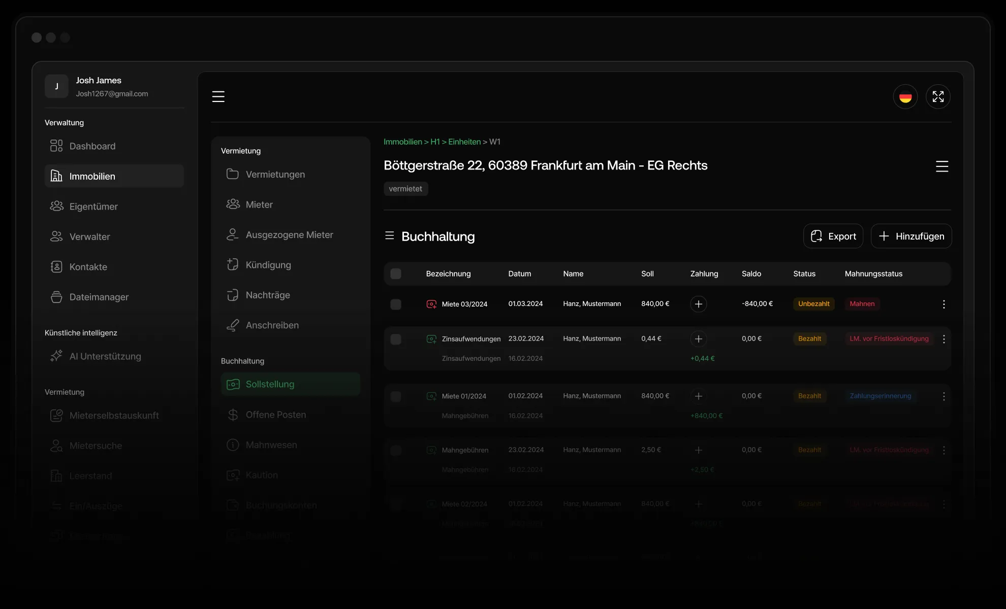 Alle Zahlen. Alle Vorgänge. Kein Kopfzerbrechen. Ihr persönliches Eigentümer-Cockpit zeigt live: Mieteingänge, Wartungen, Abrechnungen – alles dokumentiert, alles im Griff.